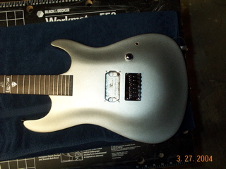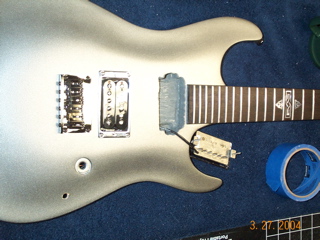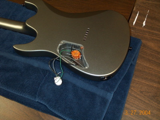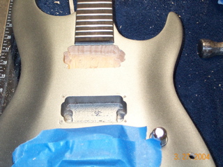you can see that I already ran the wire from the neck pickup through to the back. Fortunately, Sue had some "pewter" acryllic paint available, so I painted the cavity (if you look closely at the guitar you would be able to see some of the bare wood when examining the neck pickup, so I wanted it to look good) and took a break while it dried: