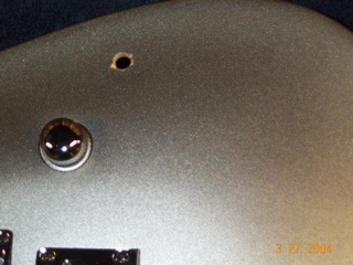 OK, now the hard part. How am I going to add another pickup and a switch? I'm going to have to cut into the guitar! I decided on using a rotary 5 position switch instead of a lever based one--I felt it would give the guitar a unique look and I felt better about cutting a hole for a POT type control as opposed to a lever. So I began with a hole for a new control: